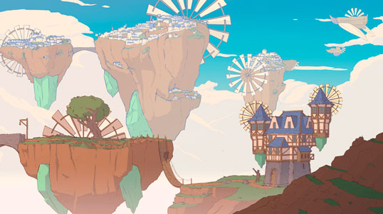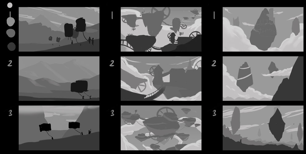 Background design process; 4 different regions were conceptualized, based on different player traits recognized from the user research, from thumbnails to color.