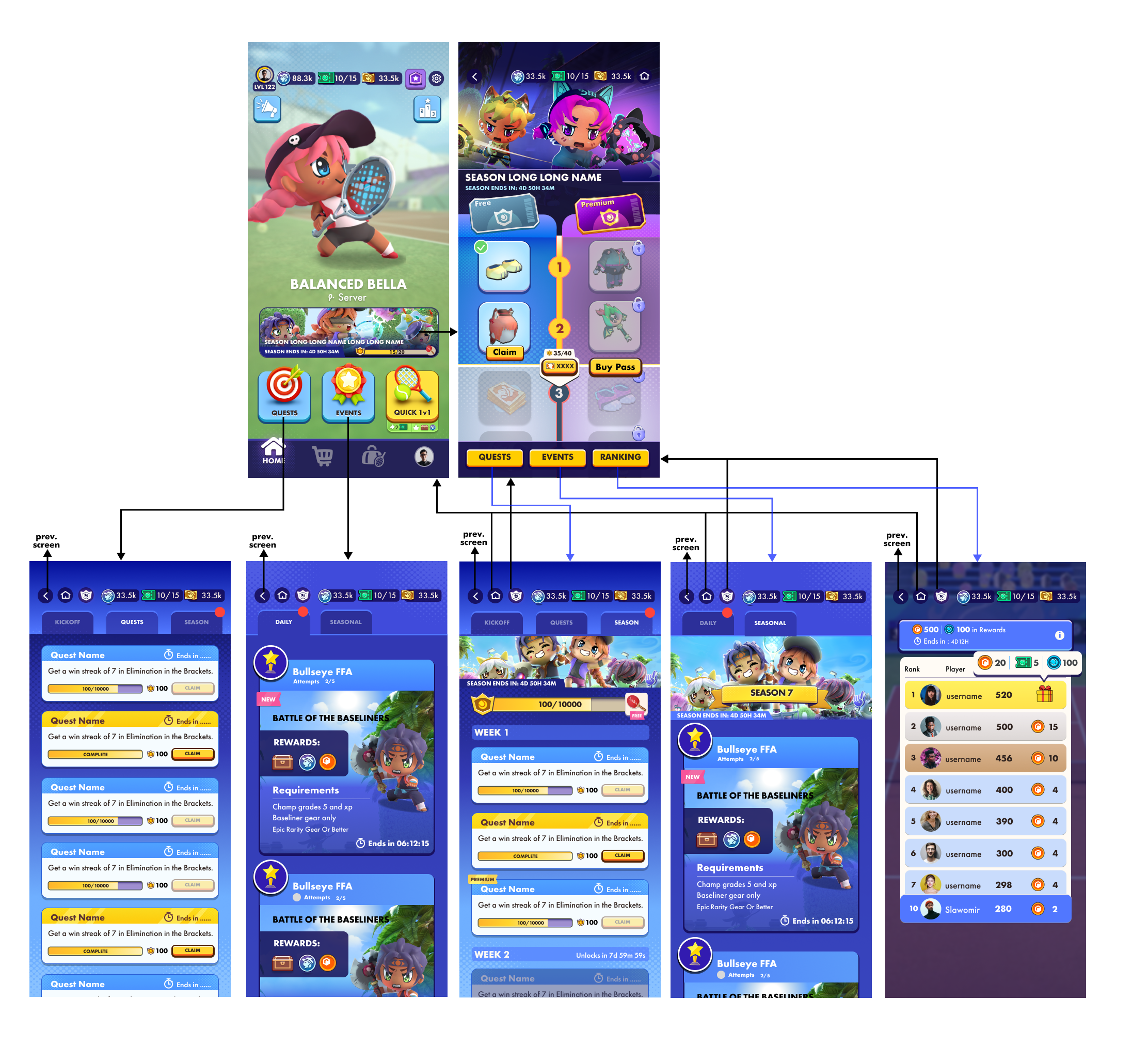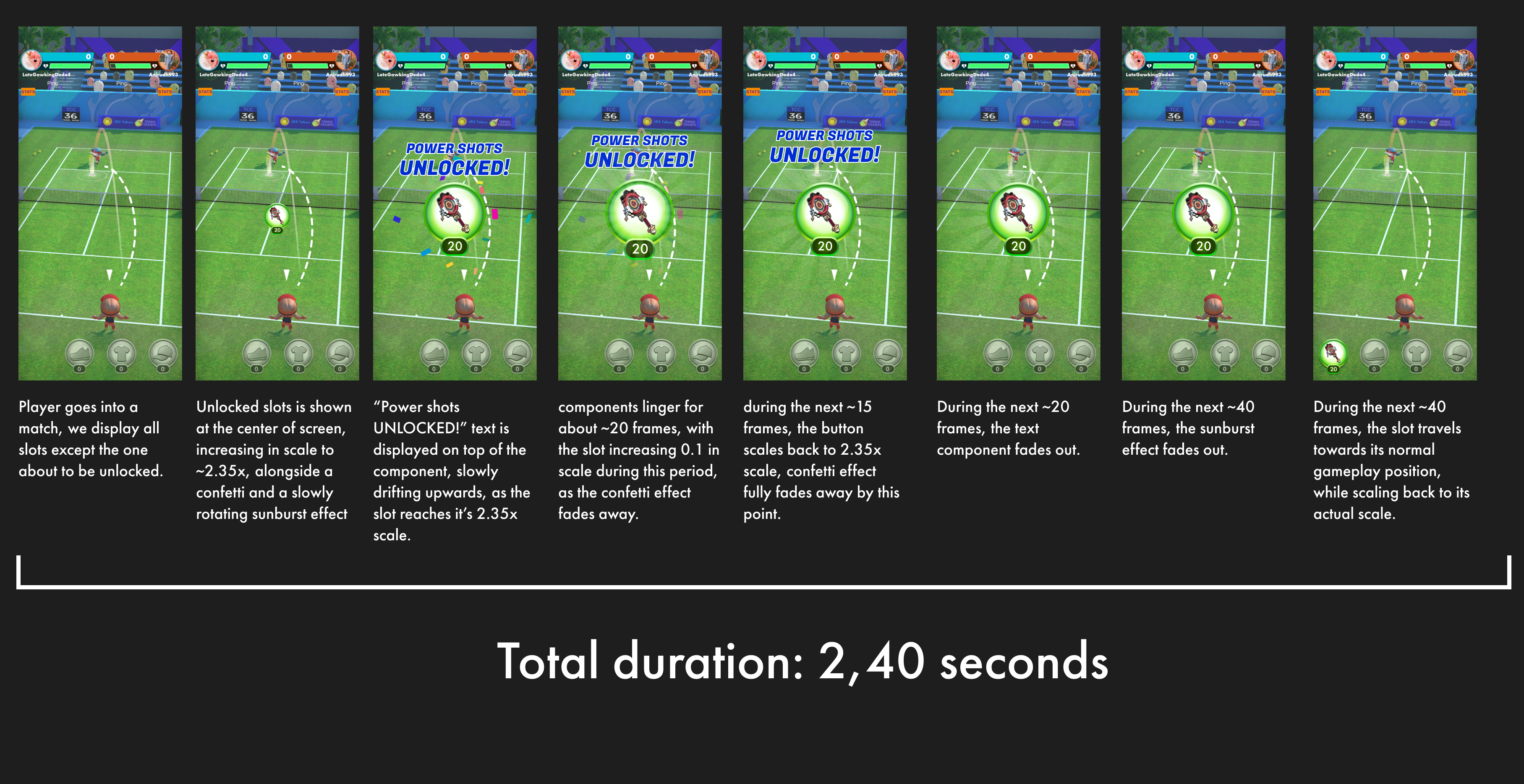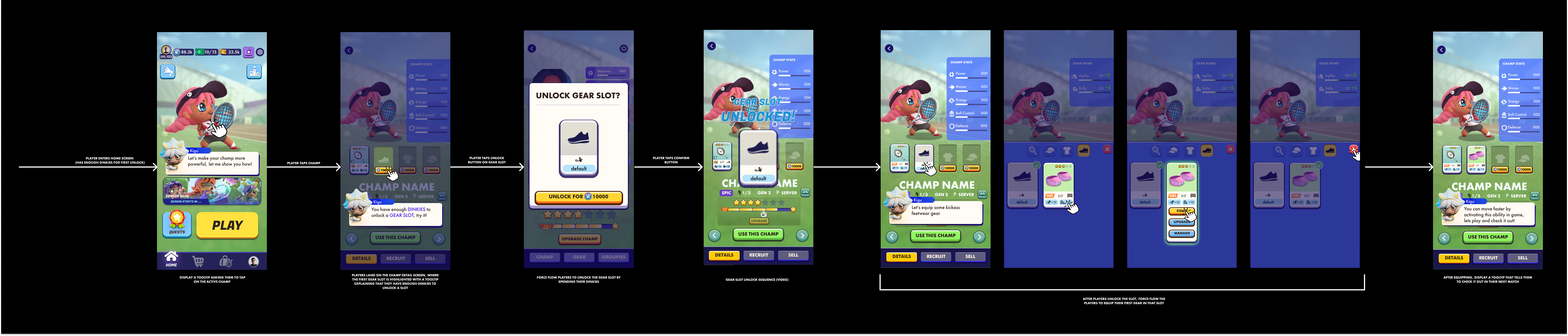 Other aspects of my work included structuring the first time user experience flows for the general induction into the game as well as for specific features that unlocked later on, as well as helping with the sequencing of the animations of each ui flow