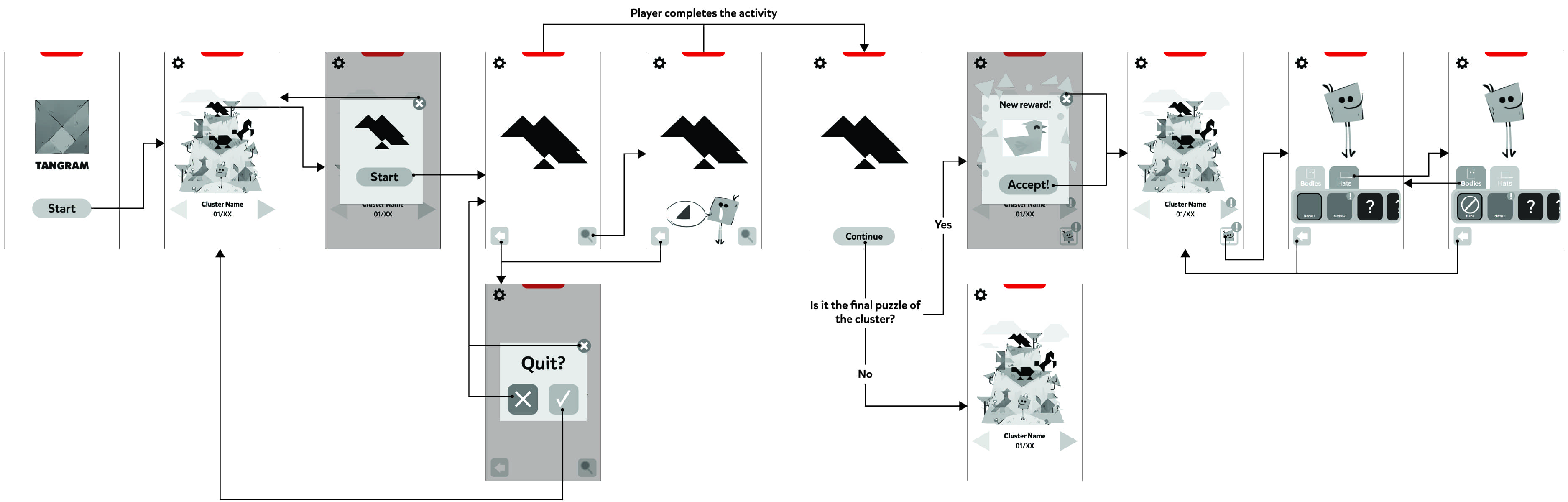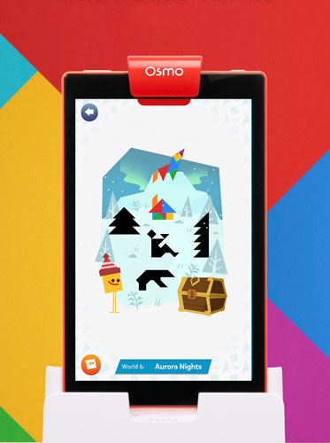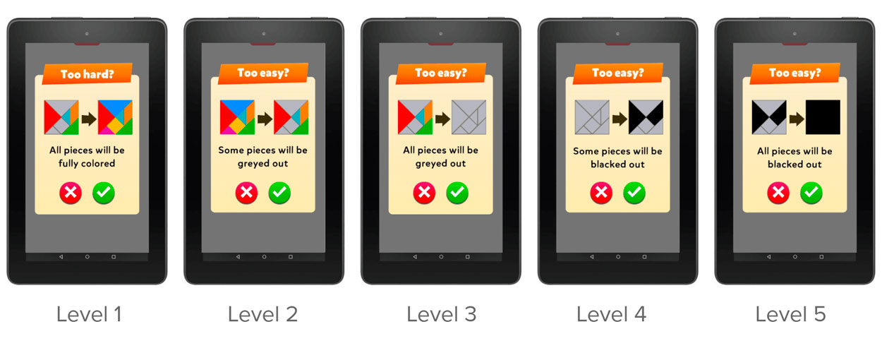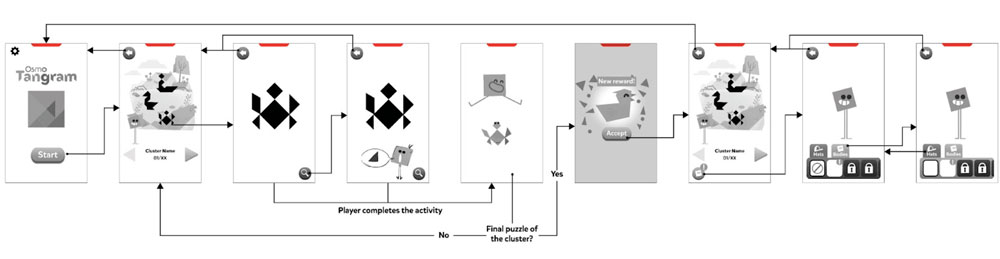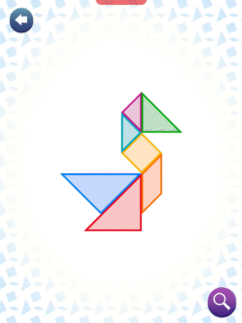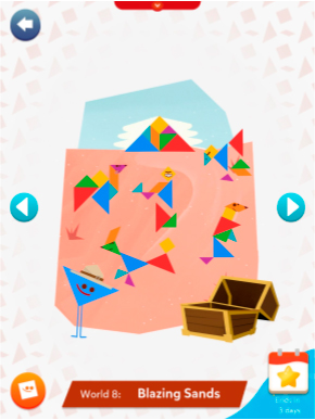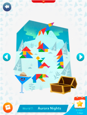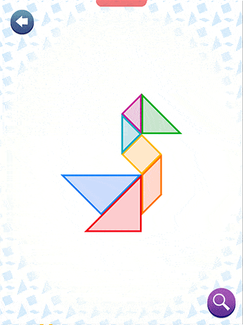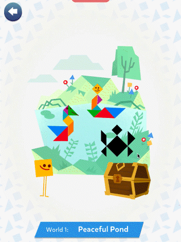 In this case, the focus on the UI was on colorful and easy to recognize shapes, favoring rounder shapes in order to contrast with the more angular shapes of the characters and the tangrams.