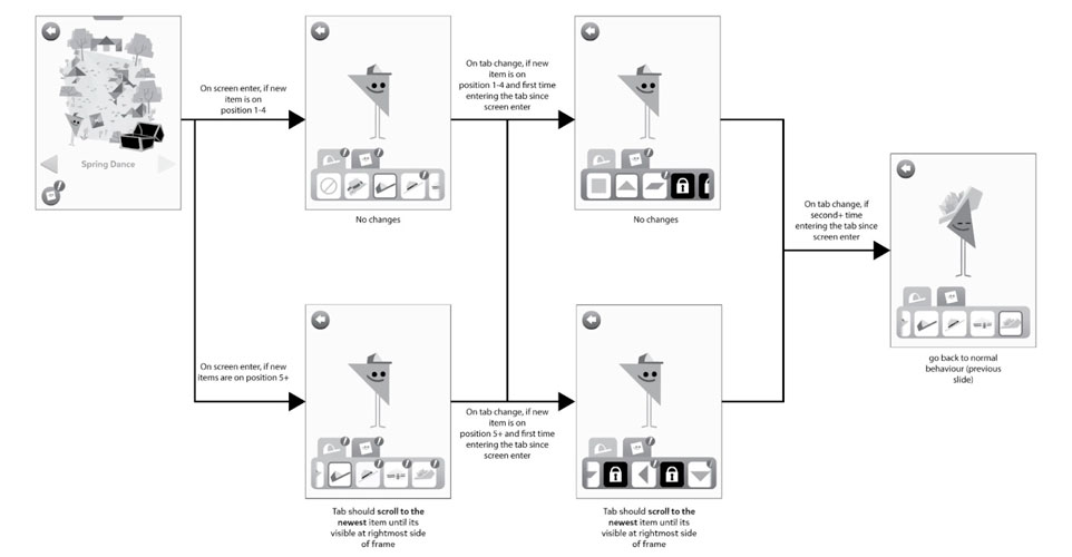 Some of the flow charts created for the different scenarios in the game, much of the design was to make it very easy to understand while minimizing the use of text for kids that can't read.