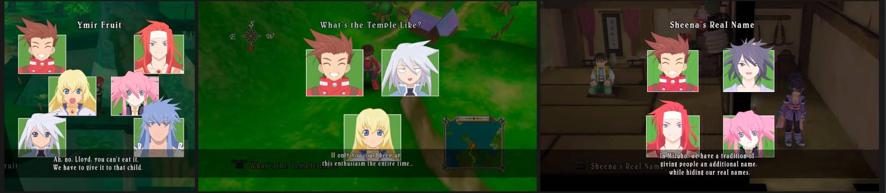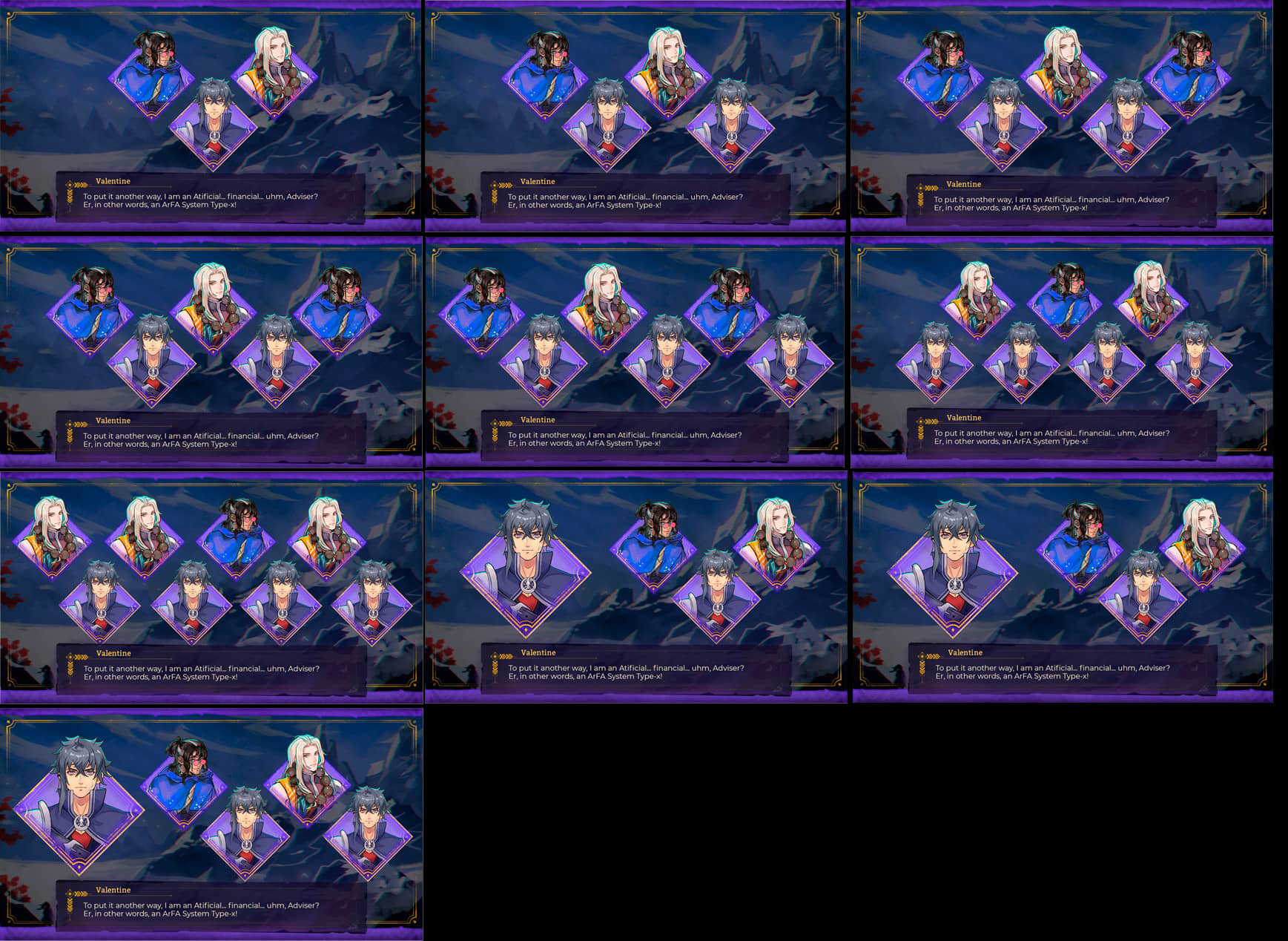 Functionally, we wanted to create a dialogue screen similar to what Tales of Symphonia does for their multi-character conversations. We wanted to be able to include multiple actors in a single screen, with enough flexibility to encompass multiple compositions and animations based on how many actors are on screen.