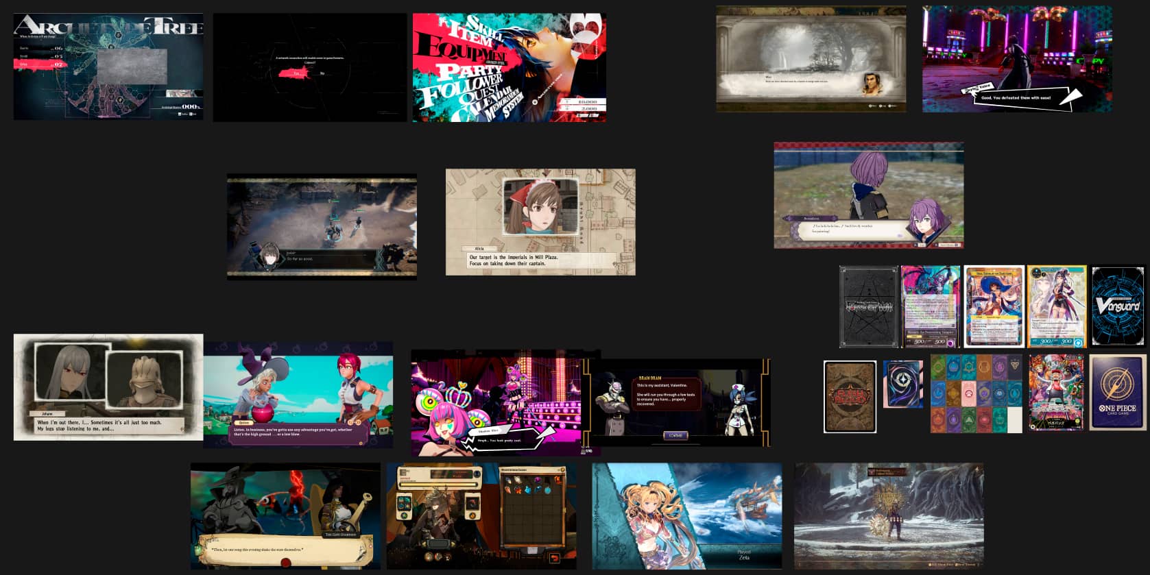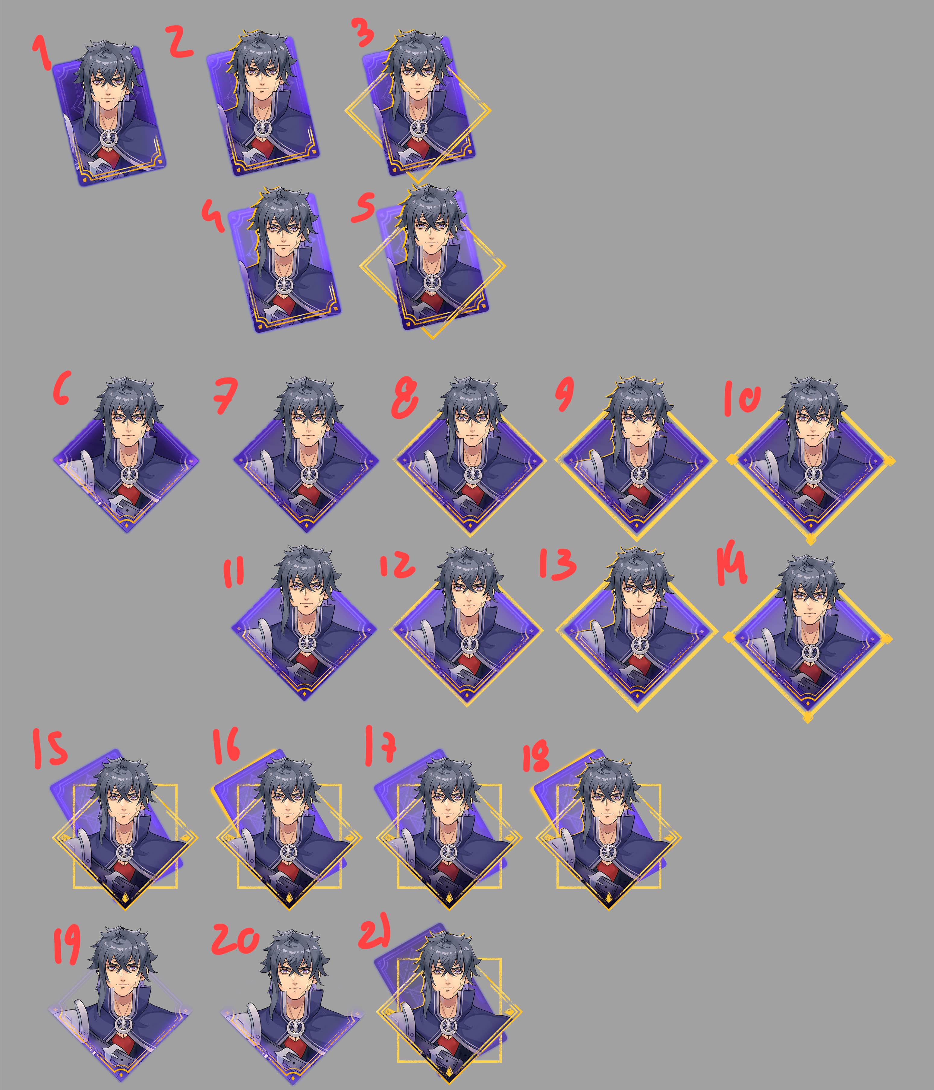 I started the visual design process by collecting references with interesting visual solutions from other games specific to this kind of screen, to compliment our main body of visual reference for the overall style of the ui. A particular breakthrough here was the use of TCG card back to inform the design of the ornamental borders in the screen, something that we were struggling to get right initially.