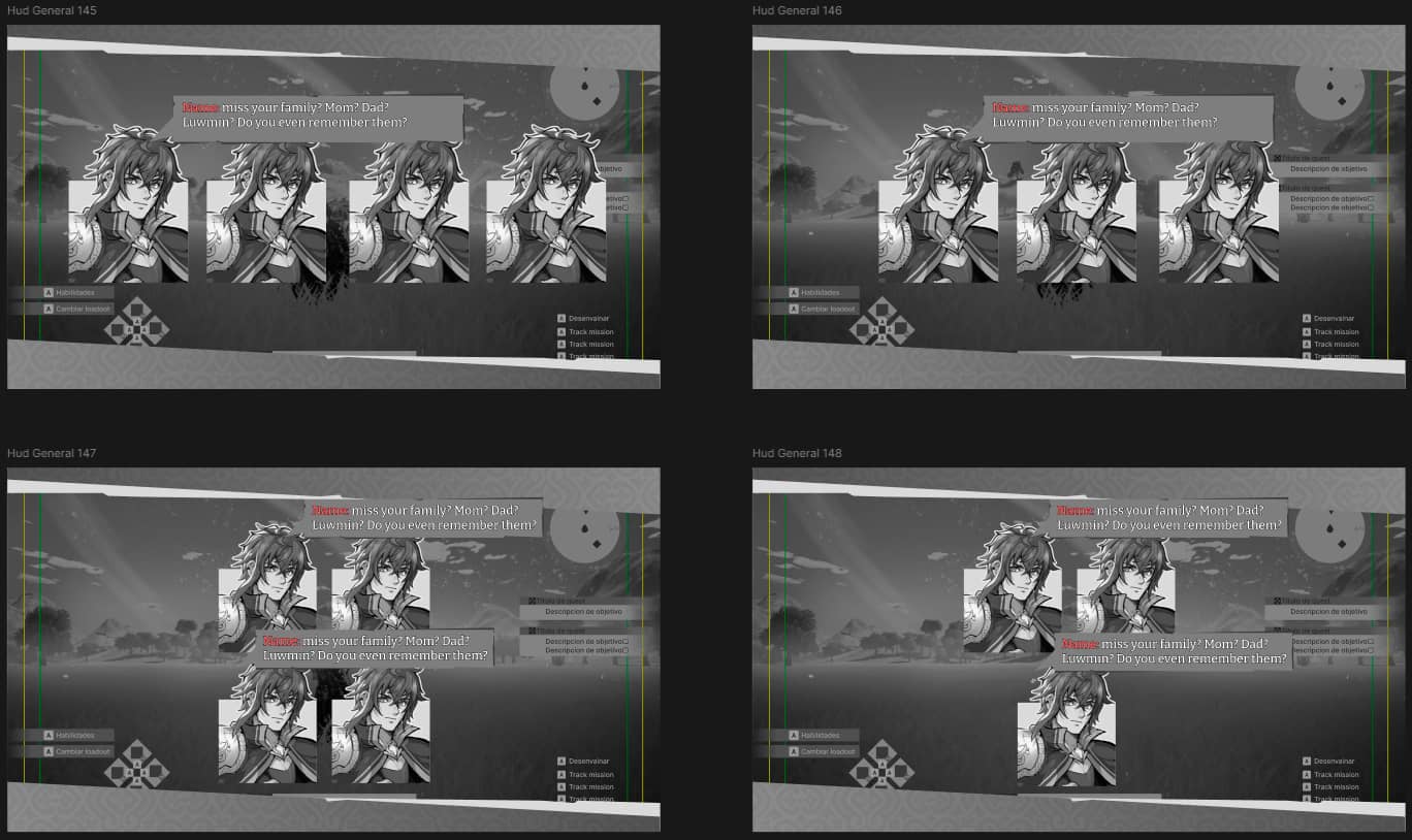 For this specific example, my responsibility was to work together with the Game designer and Art director in order to flesh out the UI for a multi-character conversation, later using that to determine the initial guidelines for the style guide and visual identity of the UI